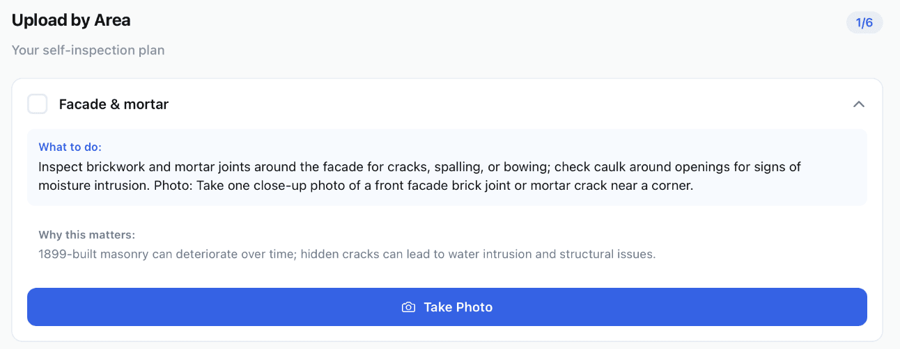 Our guided upload mode walks you through the most important photos to take and upload, but upload anything that looks important!